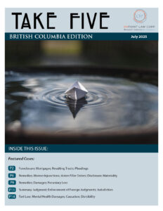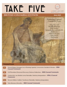 Summarized Cases: Insurance Corporation of British Columbia v Dhaliwal, 2025 BCCA 142: Personal Injury; Damages; Loss of Earning Capacity; Concessions; Standard of Review ~ Counsel Comments by Greg Allen and Danielle Wierenga, Counsel for the Respondent Trigon Pacific Terminals v Prince Rupert Port Authority, 2025 BCCA 155: Civil Procedure; Document Discovery; Evidence; Redactions ~ Counsel Comments by Mark Youden, Quinn Rochon, and Gabrielle Matheson, Counsel for Ridley Island Energy Export Facility Limited Partnership Kingdom Langley Project Limited Partnership v WQC Mechanical Ltd, 2025 BCCA 169: Construction Law; Builders Liens; Remedies; Statutory Interpretation ~ Counsel Comments by Michael Morgan, Counsel for the Respondent, WQC Mechanical Ltd. ~ Counsel Comments by Chris Moore, Counsel for the Respondent, Metro-Can Construction (TC) Ltd. Canada (Attorney General) v Wu, 2025 BCCA 171: Tax Law; Debtor-Creditor; Foreclosure; Remedies; Statutory Interpretation Hill v Herd,2025 BCCA 173: Torts; Nuisance; Remedies ~ Counsel Comments by Tim Pearkes, Counsel for the Appellant |