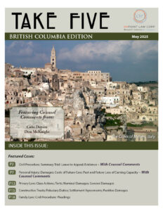 Summarized Cases: Direct Horizontal Drilling Inc v North American Construction Management Ltd, 2025 BCCA 104: Civil Procedure; Summary Trial; Leave to Appeal; Evidence ~ Counsel Comments by Cobi Dayan,Counsel for the Respondents Lewis v Gibeau, 2025 BCCA 127: Personal Injury; Damages; Costs of Future Care; Past and Future Loss of Earning Capacity ~ Counsel Comments by Don McKnight,Counsel for the Appellant Insurance Corporation of British Columbia v Ari, 2025 BCCA 131: Privacy Law; Class Actions; Torts; Nominal Damages; General Damages Chung v Chung, 2025 BCCA 136: Constructive Trusts; Fiduciary Duties; Settlement Agreements; Punitive Damages Bhatti v Grewal, 2025 BCCA 138: Family Law; Civil Procedure; Pleadings |
