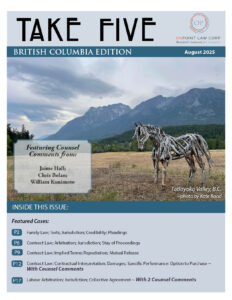 Summarized Cases: Dignard v Dignard, 2025 BCCA 43: Family Law; Division of Property; Capital Gains Tax Chisholm v Valemount Forest Products Ltd., 2025 BCCA 48: Public Law; Immunity; Transportation; Statutory Interpretation ~ Counsel Comments by Robert McNeney,Counsel for the Appellant Schrader v Schrader, 2025 BCCA 50: Family Law; Spousal Support; Separation Agreements Wilkinson v Chartier, 2025 BCCA 53: Summary Judgment; Estates; Trusts; Limitation Periods; Discovery ~ Counsel Comments by J. Michael Hutchison, K.C.,Counsel for the Appellants Ocean Pacific Hotels Ltd v Lee, 2025 BCCA 57: Class Actions; Contracts; Employment; Duty of Honest Performance |