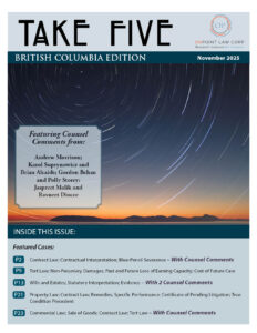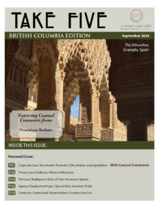 Summarized Cases: Castilloux v Mitchell, 2025 BCCA 282: Corporate Law; Shareholder Remedies; Dissolution and Liquidation ~ Counsel Comments by Dominique Roelants,Counsel for the Appellants Gondor v British Columbia (Attorney General), 2025 BCCA 281: Privacy Law; Evidence; Adverse Inferences Carriere-de-Davide v Westland Insurance Group Ltd, 2025 BCCA 283: Tort Law; Negligence; Duty of Care; Insurance Agents Mac’s Convenience Stores Inc v Basyal, 2025 BCCA 284: Agency; Employment Law; Class Action; Summary Trials Anderson Square Holdings Ltd v Zhang, 2025 BCCA 288: Contracts; Contractual Interpretation; Construction Law |