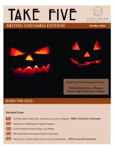 Summarized Cases: Singh v Singh, 2025 BCCA 309: Civil Procedure; Family Law; Special Costs; Leave to Appeal ~ Counsel Comments by Deborah Labun,Counsel for the Appellant ~ Counsel Comments by Garry Thomas,Counsel for the Respondent Armstrong v Abramowicz, 2025 BCCA 318: Family Law; Child Support; Spousal Support Cook v McEwan, 2025 BCCA 325: Civil Procedure; Personal Injury; Jury Notice Heritage Trust Company Inc v Garrett, 2025 BCCA 326: Wills and Estates; Insurance; Unjust Enrichment Yang v Yang,2025 BCCA 328: Family Law; Civil Procedure; Divorce Orders; Jurisdiction ~ Counsel Comments by Alison Colpitts and James Cudmore,Counsel for the Appellant |